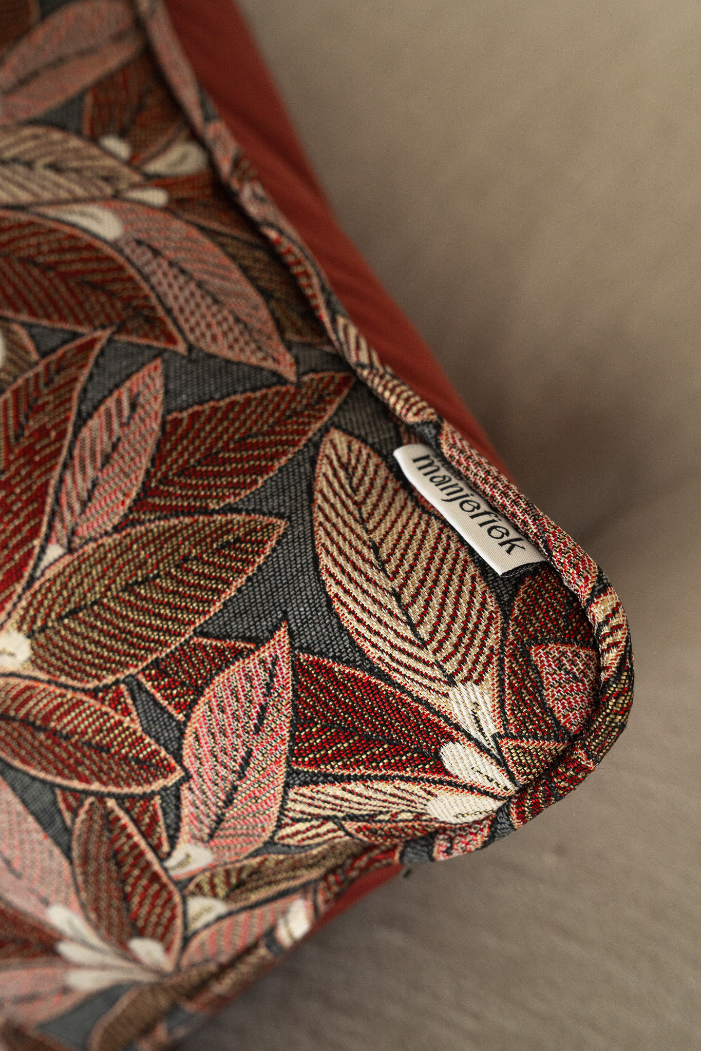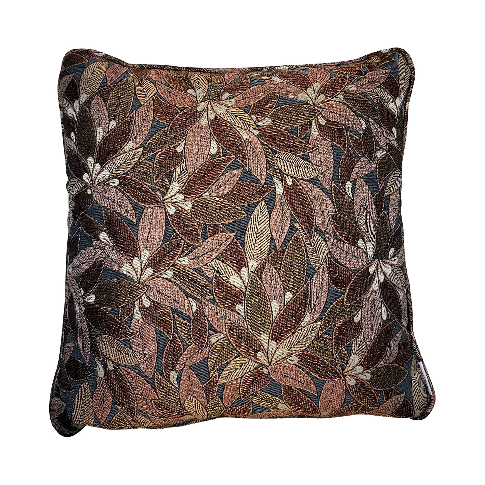 Voorzijde: handgemaakte jacquard sierkussen met bladdessin, gemaakt van polyester en katoen, met warme herfsttinten